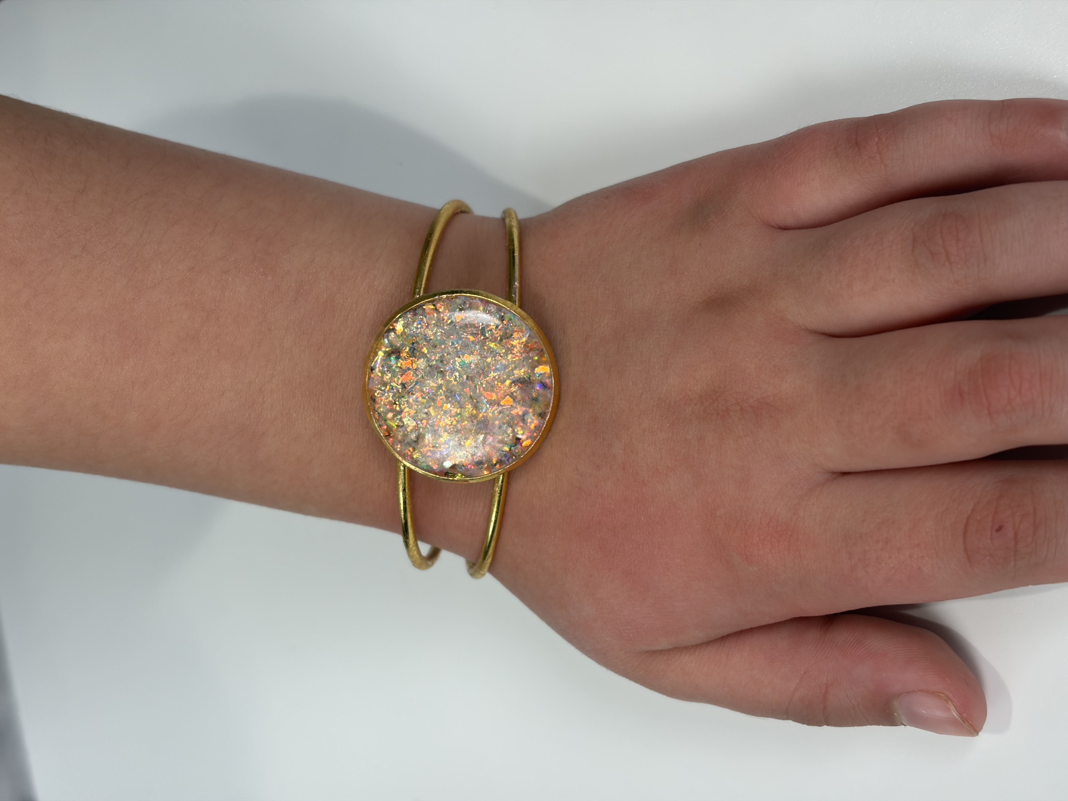 • Material: Gold-plated alloy, Resin, Iridescent Opal glitter flakes