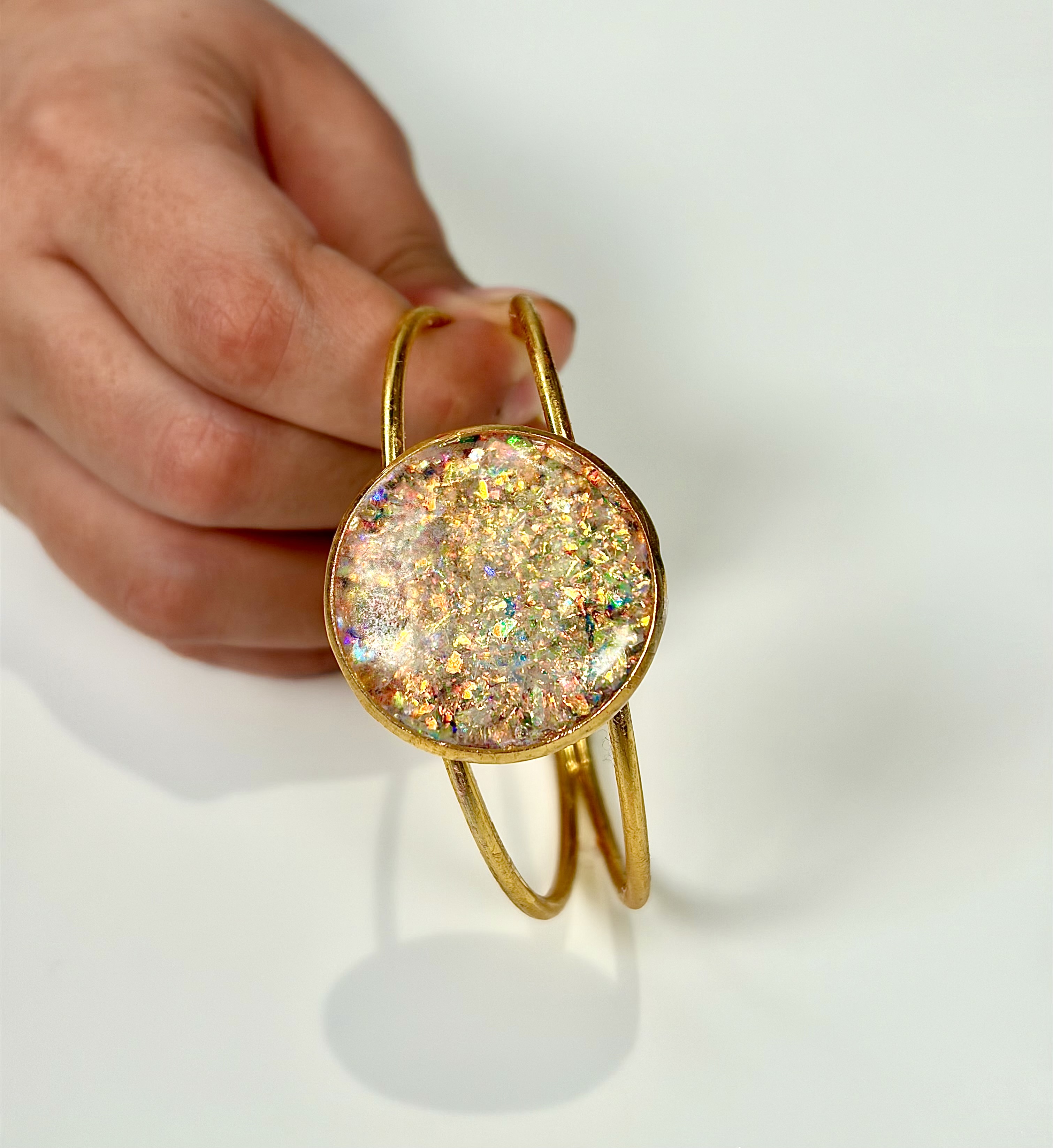 Elevate your style with this stunning handmade gold cuff featuring a shimmering iridescent center. Lightweight, elegant, and perfect for stacking or solo wear.
