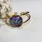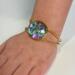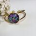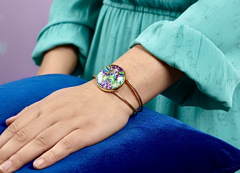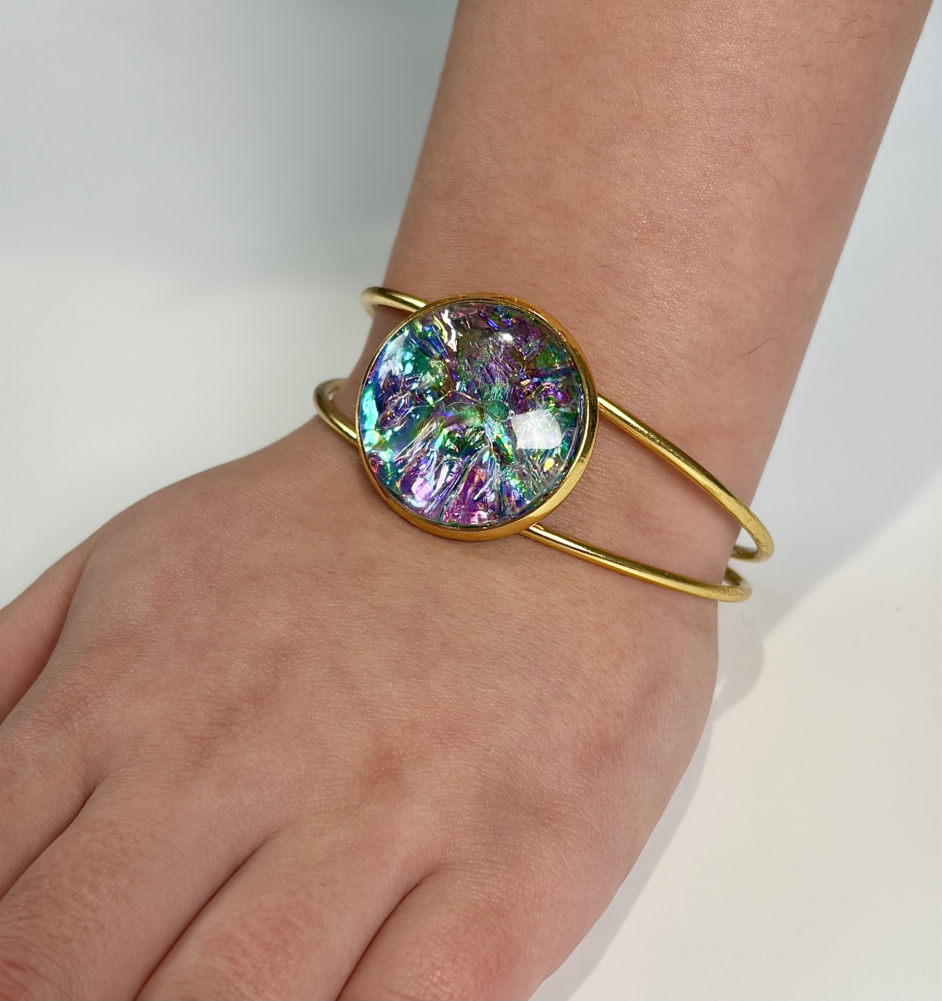 This eye-catching bangle bracelet features a vibrant, multi-colored dichroic sheet under a clear glass 1 inch cabochon. It captures and reflects light from every angle, creating a mesmerizing "oil slick" effect of deep purples, light teals, and electric blues.