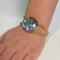 The centerpiece is securely nestled in a polished gold-finished open cuff, offering a modern and elegant silhouette. Its adjustable open-back design ensures a comfortable fit for most wrist sizes, making it a versatile addition to both casual daywear and sophisticated evening ensembles.