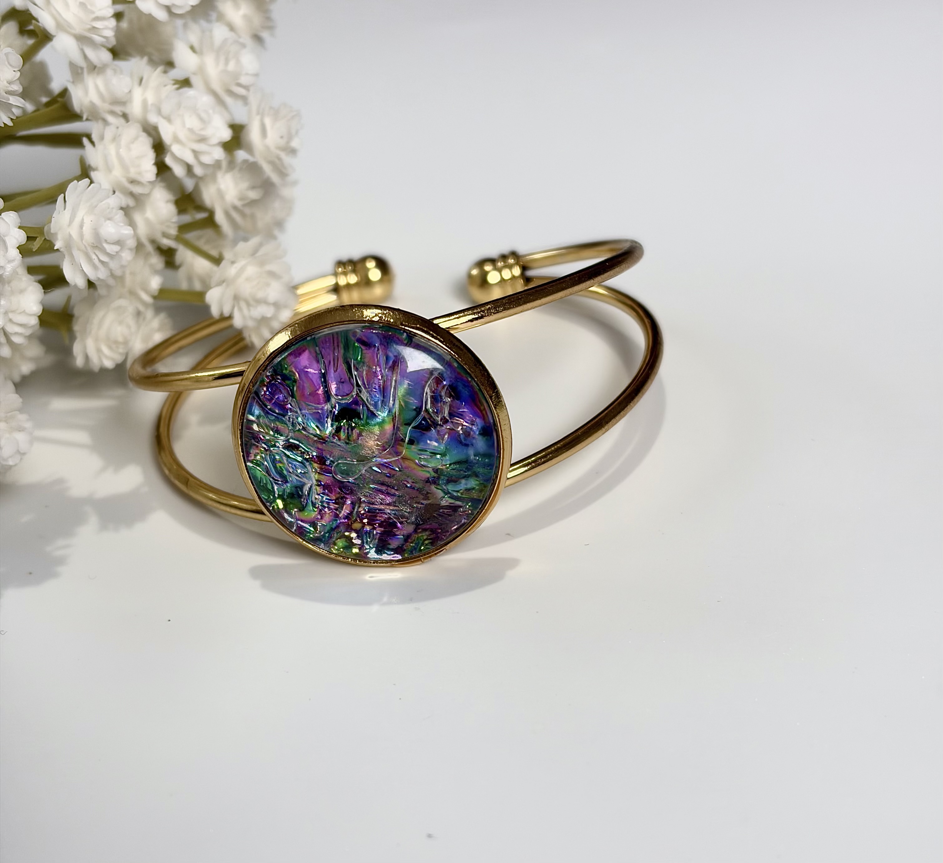 • Unique Artistry: Each iridescent center features a one-of-a-kind swirl of colors, ensuring your piece is truly unique.