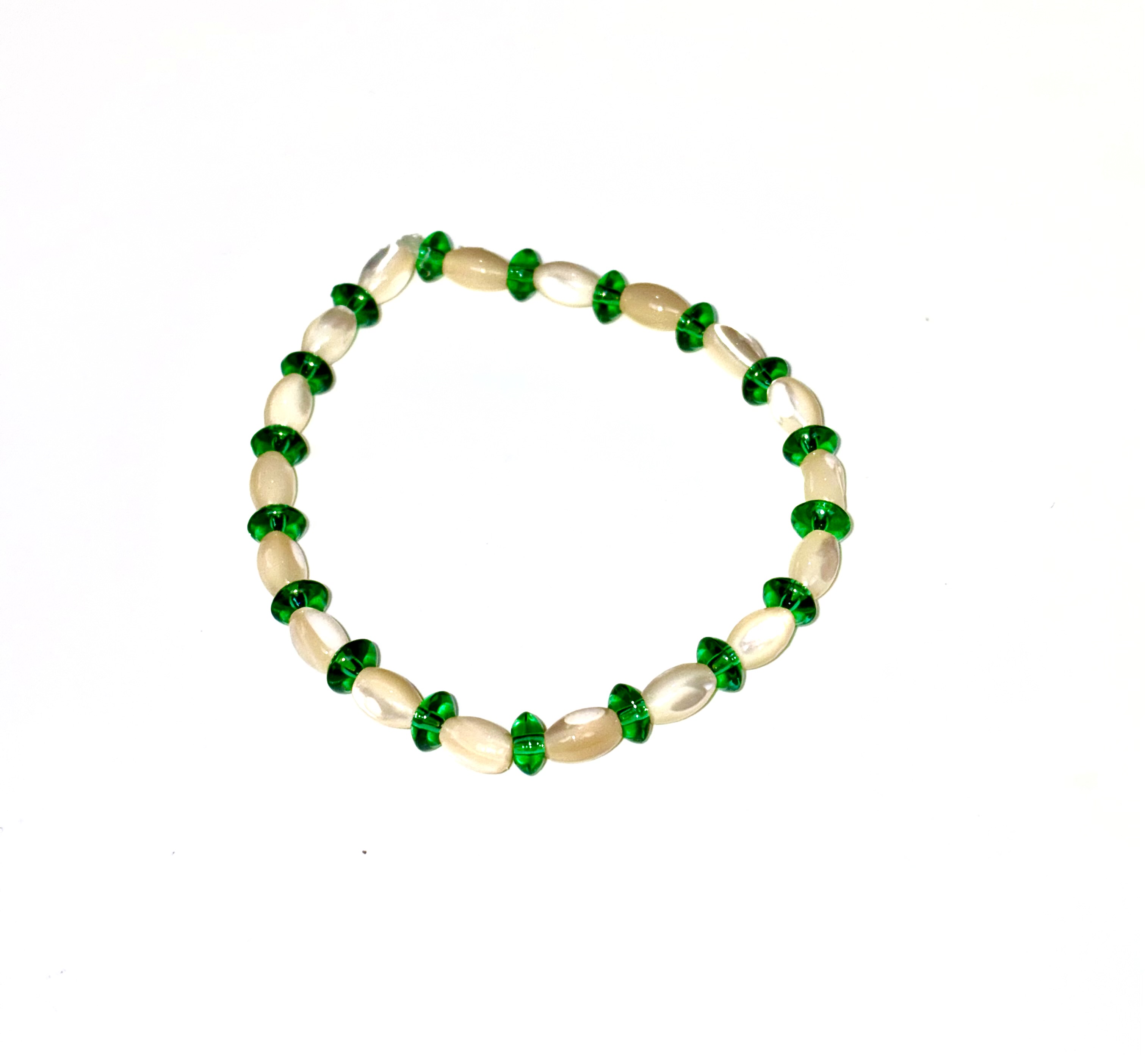 Capture a touch of nature's elegance with this striking handcrafted beaded bracelet. Featuring translucent emerald-green spacers and luminous cream-colored mother of pearl shell rice beads, its minimalist yet vibrant palette makes it an ideal accessory for both everyday wear and special occasions.