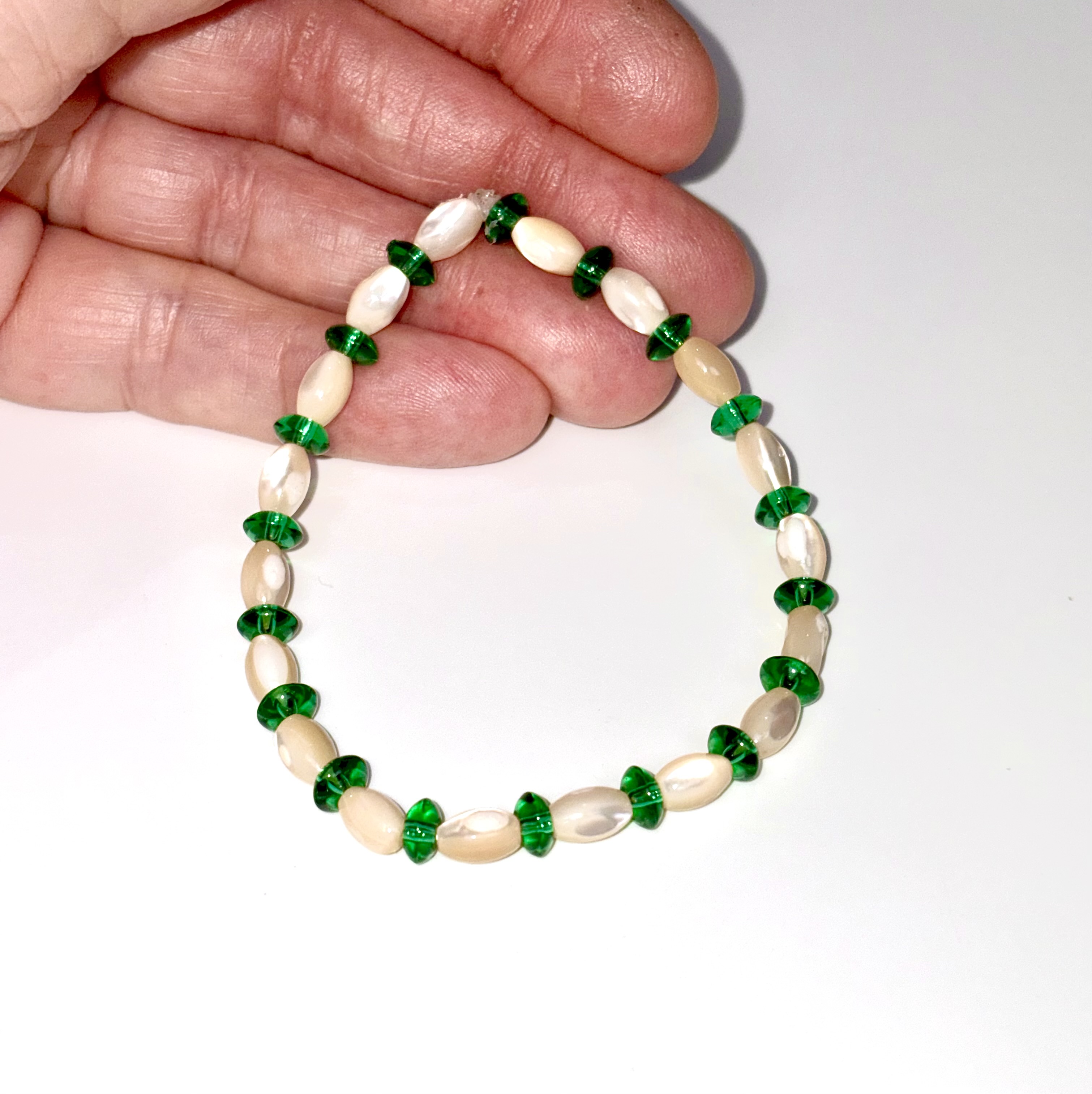 • Beads: Translucent faceted green glass spacers and natural colored mother of pearl rice beads.