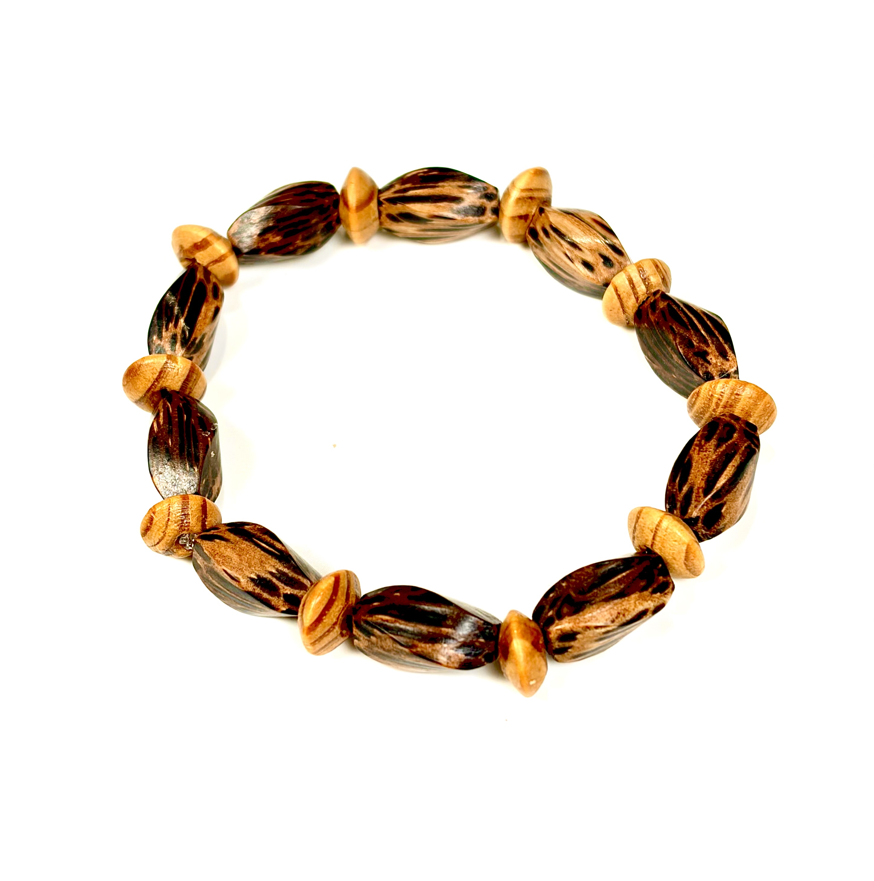 Ground your style with our Old Palmwood Twist Bracelet. This piece features uniquely textured, twist-shaped beads crafted from authentic Old Palmwood. The deep, dark grain is beautifully offset by smooth, honey-toned wooden spacers, creating a rhythmic pattern that feels both ancient and modern.
