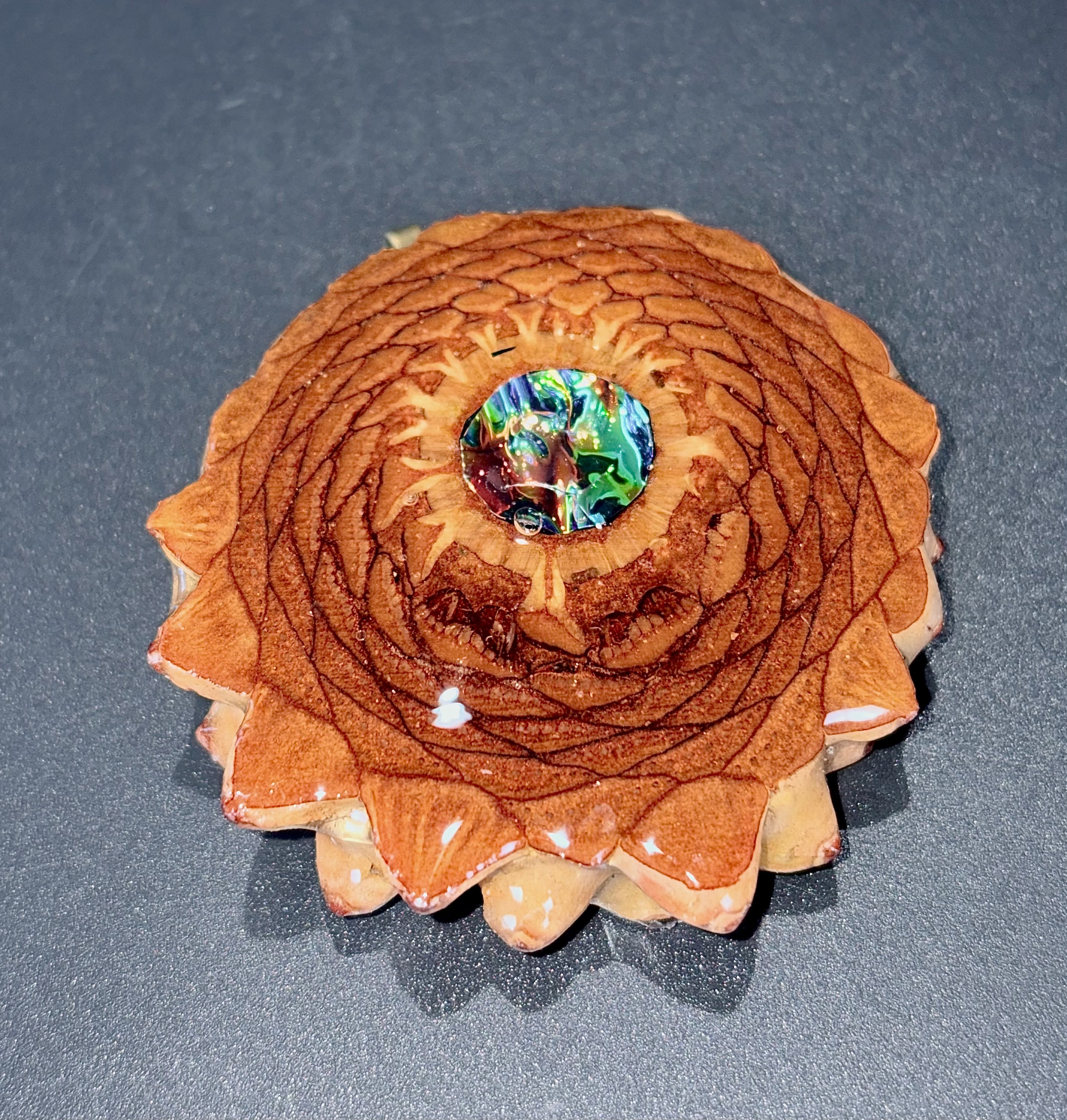 At the heart of the design lies a luminous, iridescent dichroic film inlay that shimmers with brilliant greens, blues, and magentas. This central jewel mimics a hidden treasure found deep within nature, providing a captivating focal point.