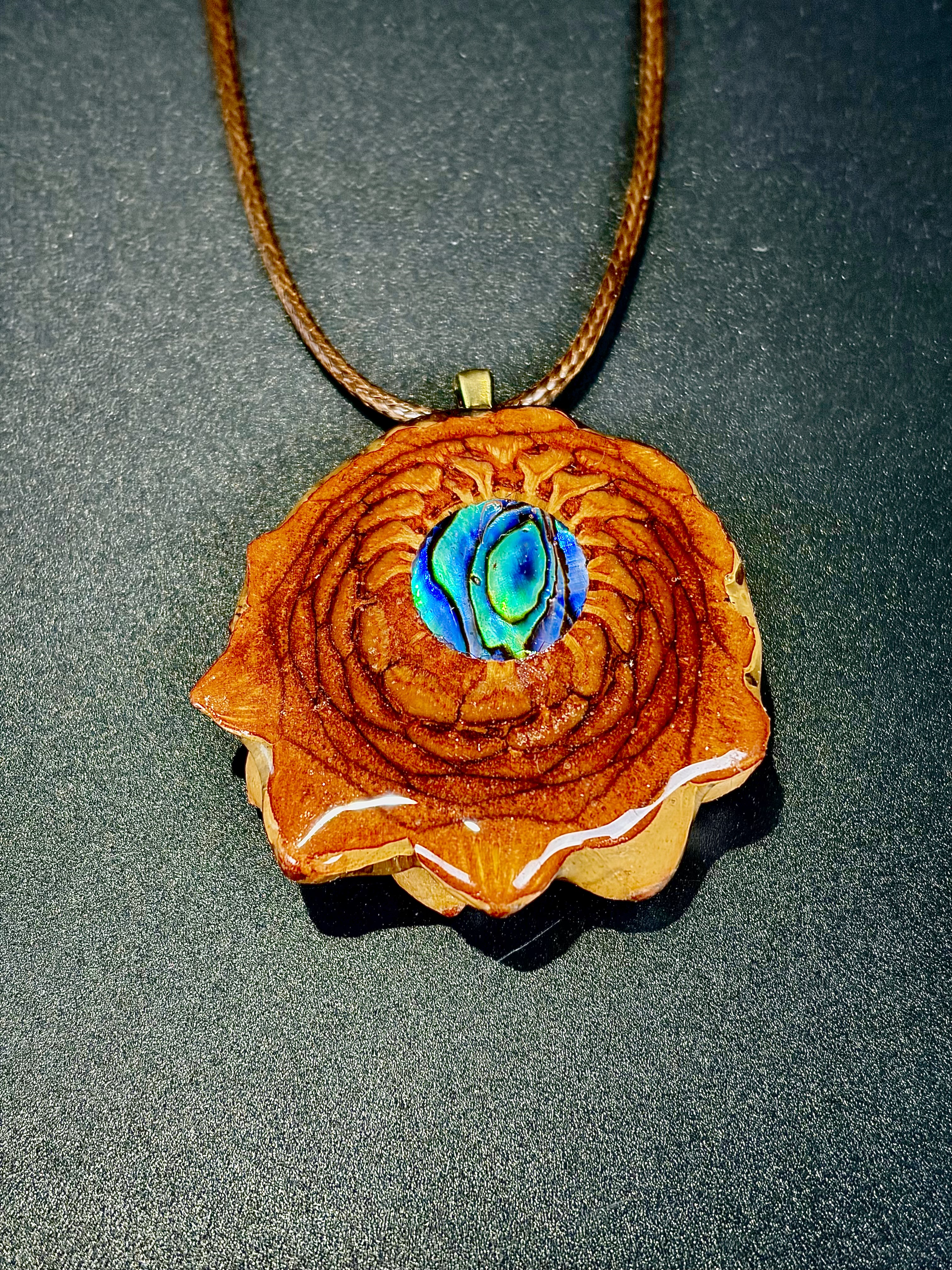 At the heart of the pendant is a round glossy piece of abalone shell, eye-catching and iridescent, that displays brilliant flashes of green, blue, and black. This striking contrast between the earthy wood and the vibrant shell center makes it a true statement piece.
