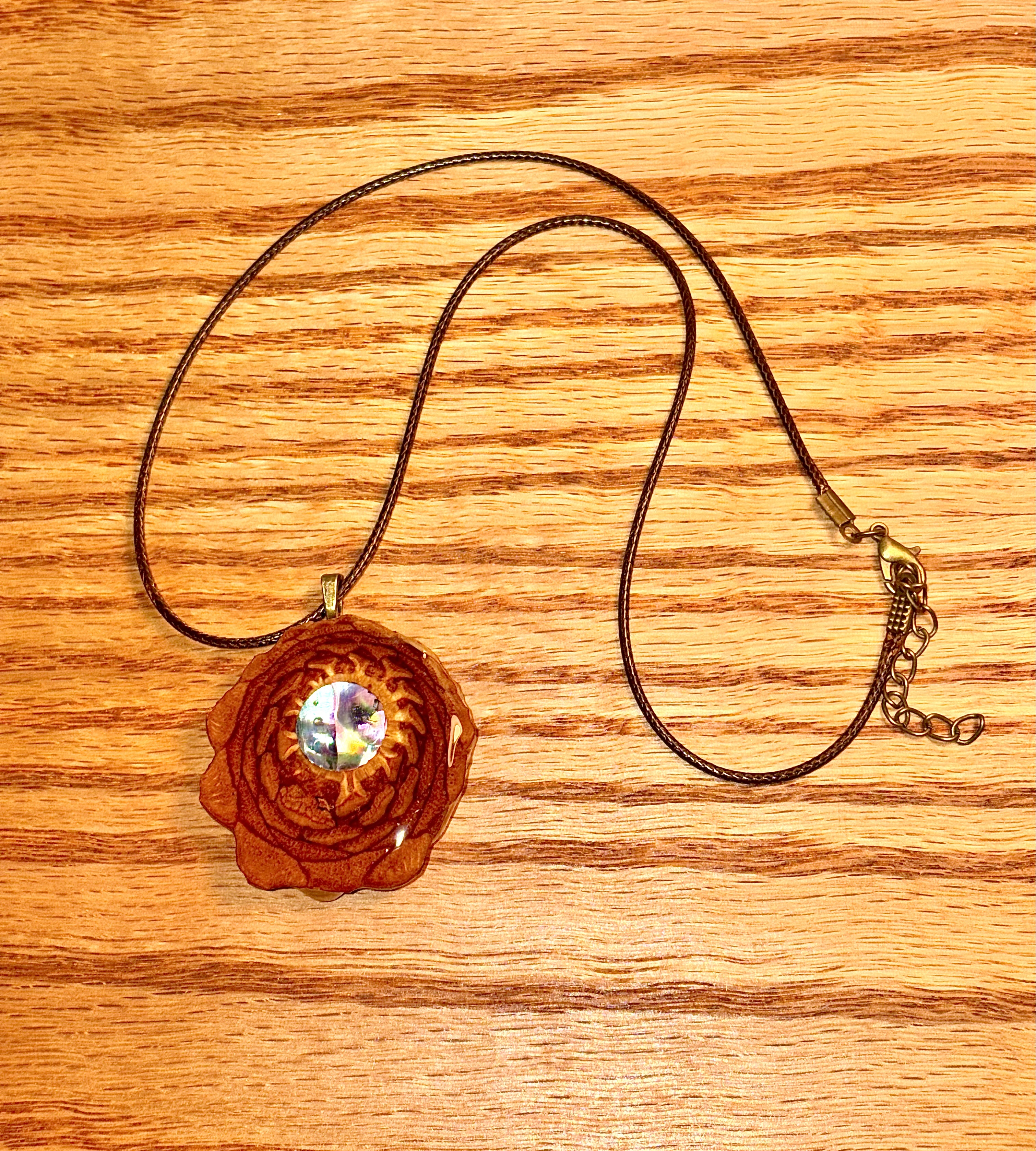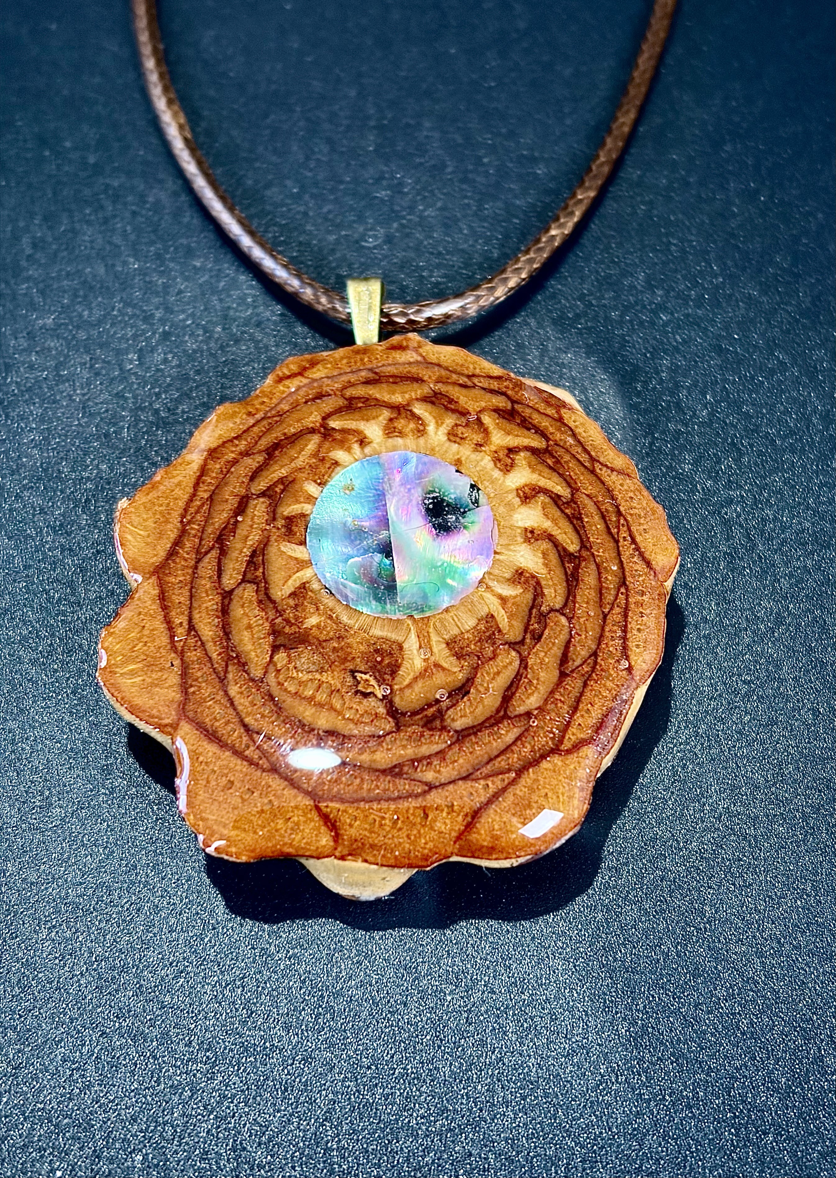 At the heart of the pendant is a round glossy piece of Mother of Pearl shell, eye-catching and iridescent, that displays brilliant flashes of peacock blues, greens, golds, and magentas. This striking contrast between the earthy wood and the vibrant shell center makes it a true statement piece.