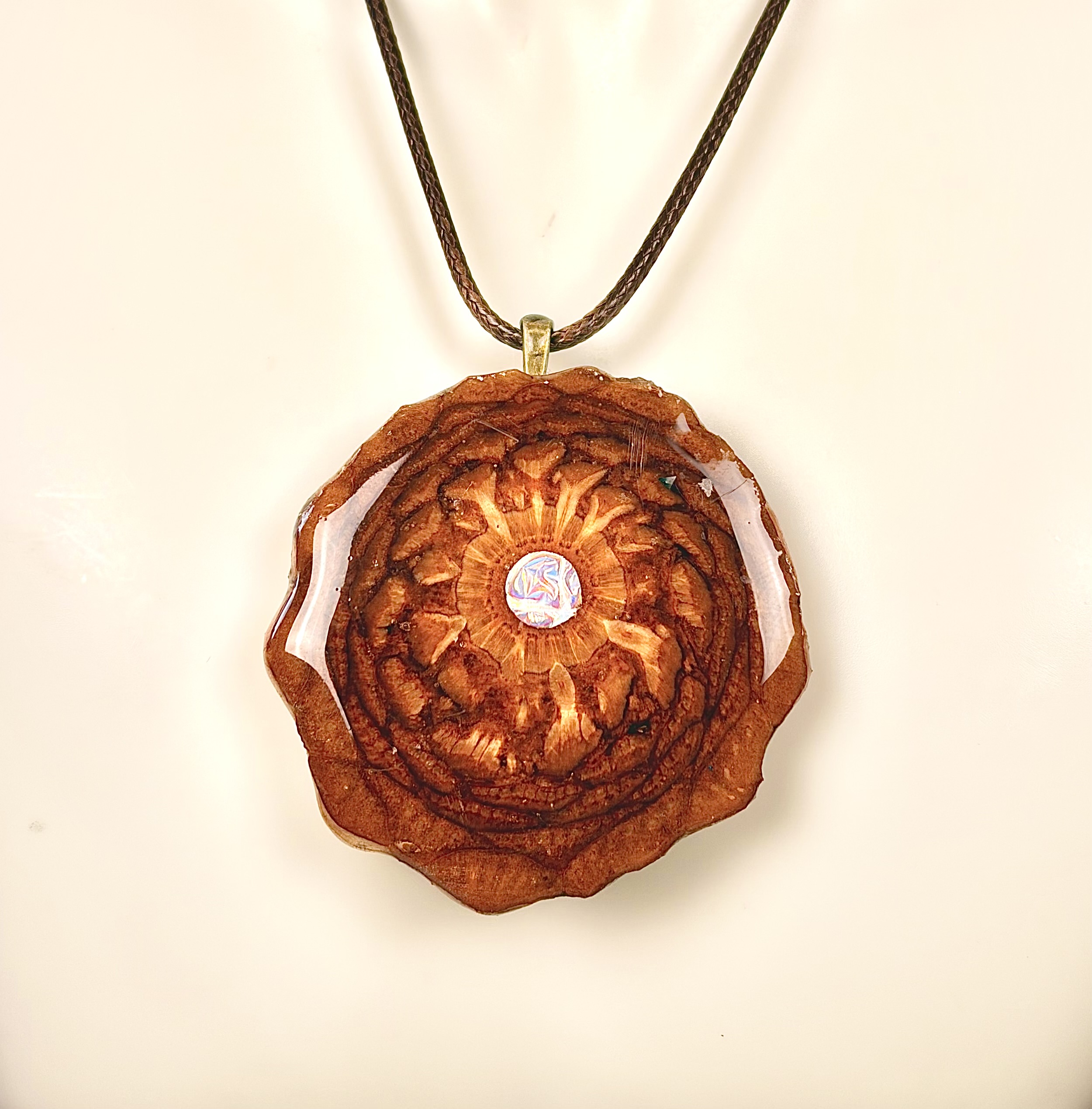 Unveil the hidden beauty of nature with this exquisite, handmade pendant necklace. Crafted from a genuine cross-section of a pine cone base, the pendant reveals a mesmerizing, natural rosette pattern often called a "Pine Cone Flower."