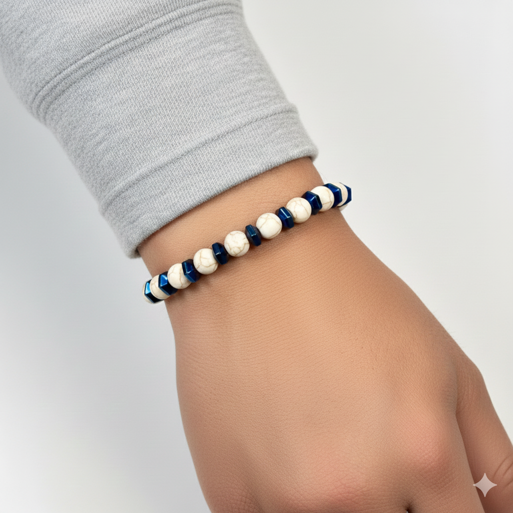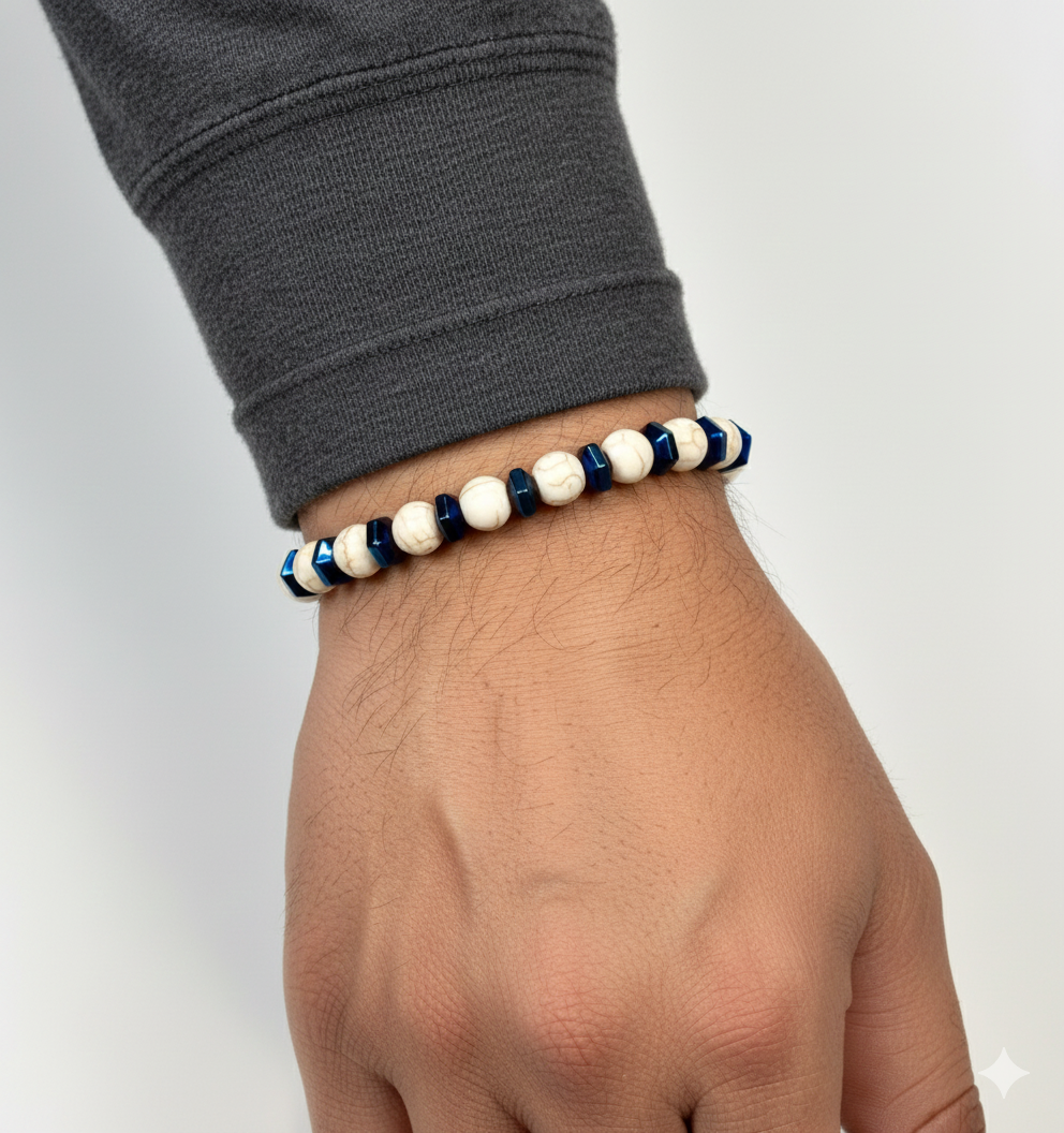 Elevate your daily accessory game with a piece that feels as good as it looks. This stretch bracelet features natural white howlite (the marbled white beads), known for their distinct grey marble-like veining, punctuated by striking, faceted hematite blue spacers (the dark blue beads), that catch the light with every movement.