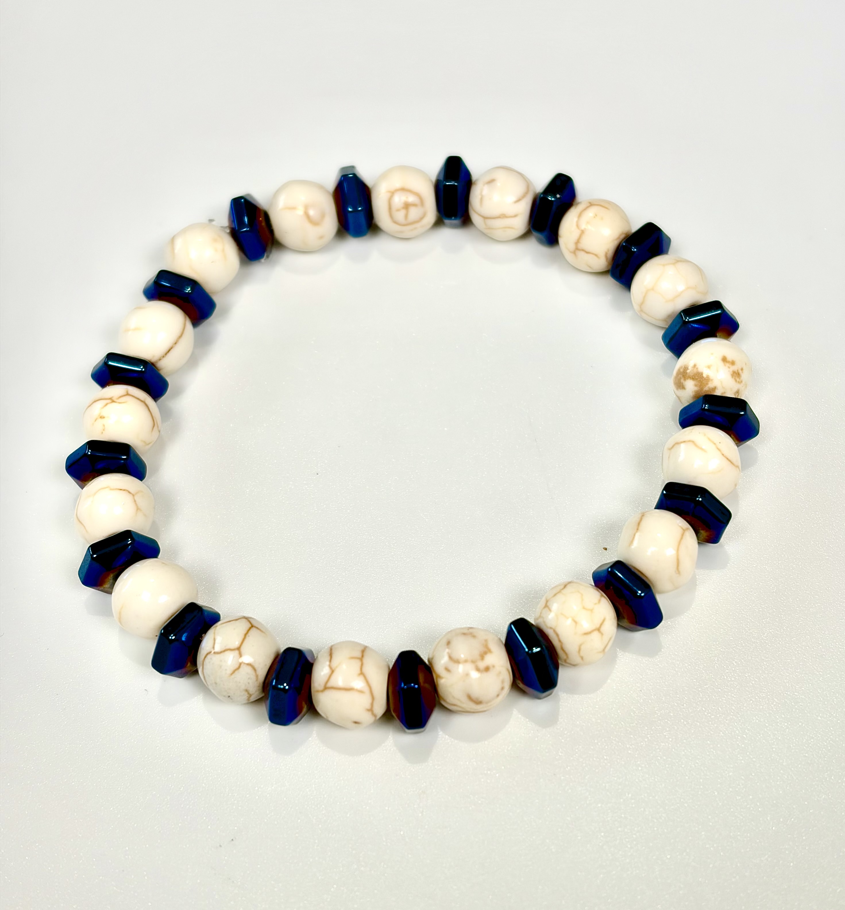 • Materials: Authentic White Howlite (8mm round) and faceted Blue-plated Hematite spacers.