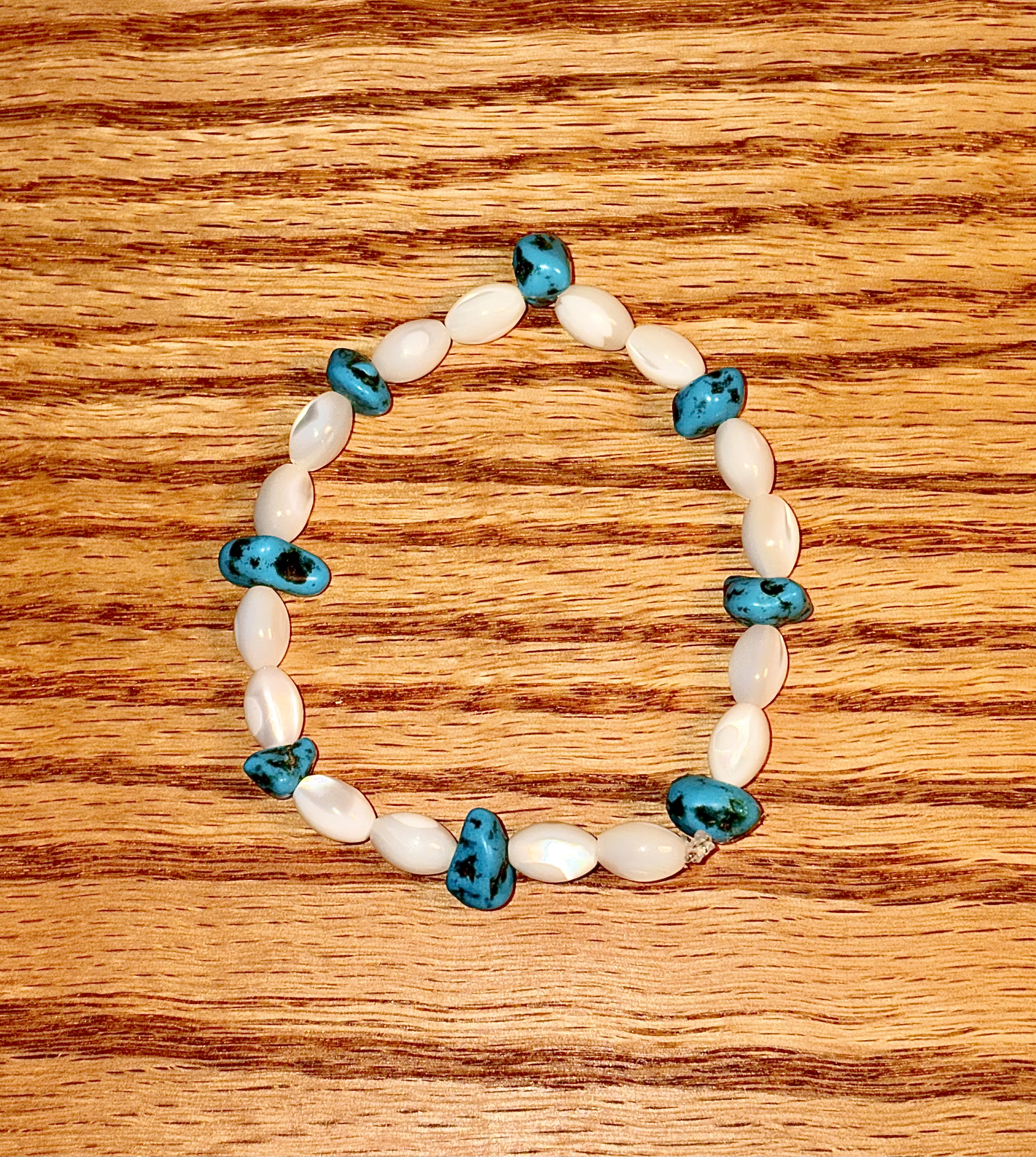 This beautiful stretch bracelet captures a perfect blend of oceanic elegance and southwestern flair. It features a continuous design alternating between two distinct types of beads: