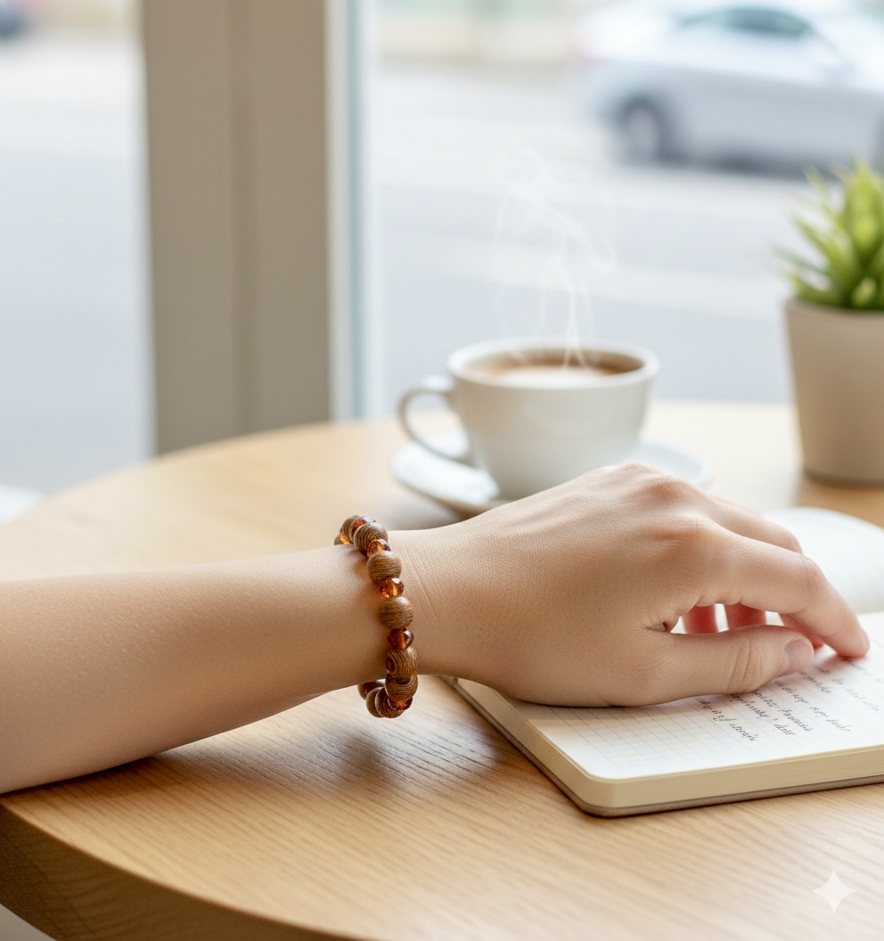 The design alternates between richly grained wooden beads and faceted amber-colored crystals, creating a beautiful play of light and texture. The natural patterns in the wood offer a rustic, grounded feel, while the sparkling spacers add a refined, jewelry-grade finish.